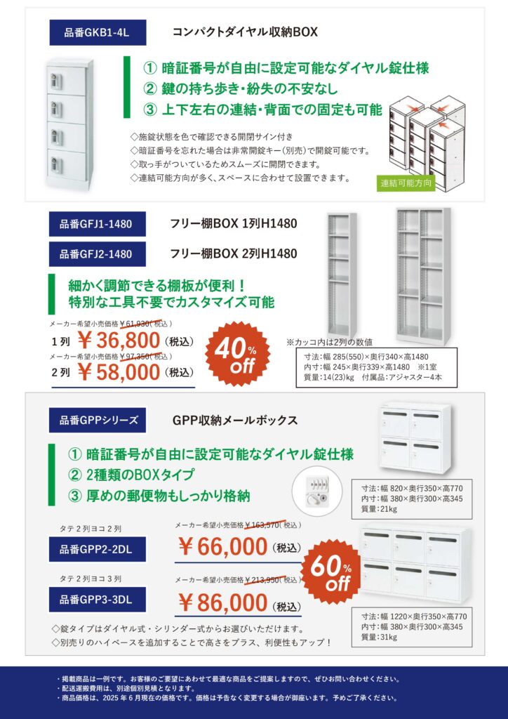 期間限定 秋の特別キャンペーン! 2025年11月13日 by groove-fp2 鍵付きロッカー(秋の特別キャンペーン)ダウンロード 氏名(必須) メールアドレス(必須) 電話番号(必須) GKB1-4L コンパクトダイヤル収納BOX 012345個 GKB-2BA ベース2列 012345 GKB-2BA ベース3列 012345 GFJ1-1480 フリー棚BOX 1列H1480 012345 GFJ2-1480 フリー棚BOX 2列H1480 012345 GPP2-2DL GPP収納メールボックス 縦2列 横2列 012345 GPP3-3DL GPP収納メールボックス 縦2列 横3列 012345 メッセージ本文 (任意)